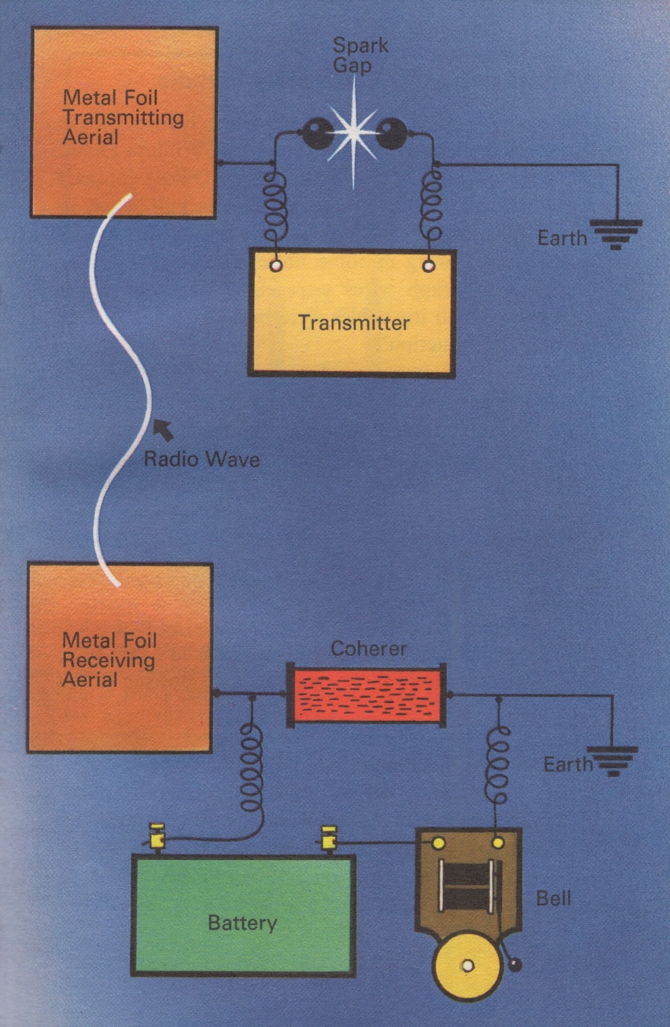 The next step was the invention of the 'coherer'. This was a small glass tube, loosely packed with iron filings which did not easily pass current from a battery connected to the tube. However, if an aerial having radio frequency currents flowing in it was connected to a coherer, then the iron filings 'cohered' or stuck more closely together and allowed the current: from the battery to flow easily through them, and so ring a bell. Therefore, each time the transmitting aerial material waves into the ether, and induced radio currents into a receiving aerial, , direct current passed from the battery through the coherer, and rang the bell.