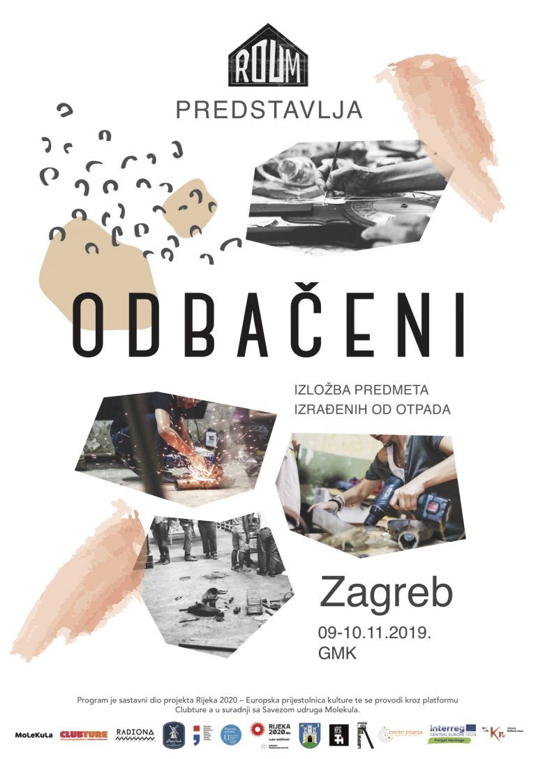 Izložba i turneja “Odbačeni” priča je o otpadu koji putem kroz Hrvatsku postaje umjetnost. Izloženi predmeti nastali su prenamjenom (nadciklažom) otpada od drva, metala i elektronike. Predmeti su izrađeni u suradnji romske zajednice, romskih umjetnika/ica i dizajnera/ica kao i suradnji s neromskim umjetnicama/dizajnericama u okviru RoUm umjetničke zajednice. Izložba sadrži priče o nastanku svakog od predmet i osoba koje su ih napravile. Tijekom igraonica s djecom kao sastavnim, interaktivnim djelom izložbe predmeti dobivaju glas osoba koje su ih izradile i “pripovjedaju” svoju priču. Izložba, baveći se odbačenim predmetima, podučava o gospodarenju otpadom, ekologiji, i konzumerizmu te doprinosi kritici suvremenog načina života s beskonačnim krugom kupovanja i bacanja predmeta. Također izložba podučava o romskoj zajednici koja je zbog vlastite marginalizacije bila osuđena na bavljenje otpadom a koja sada nastoji tu predrasudu iskoristit kao socijalni kapital u okviru pokreta RoUm svjedočeći o odbačenim ljudima. Dodatno izložba svjedoči, kroz predmete i njihove “glasnogovornike/ice” o zaboravljenim zanatima i vještinama varenja, obrade drva ali i o novim vještinama i zanatima hakiranja elektronskih uređaja. Paralelno s turnejom izložbe Rijeka-Labin-Zagreb, od 17.10 do 10.11. održat će se digitalna turneja na facebook stranici RoUma gdje će se pomoću fotografija otpada i predmeta koji su nastali iz tog otpada prikazati izloženi predmeti.